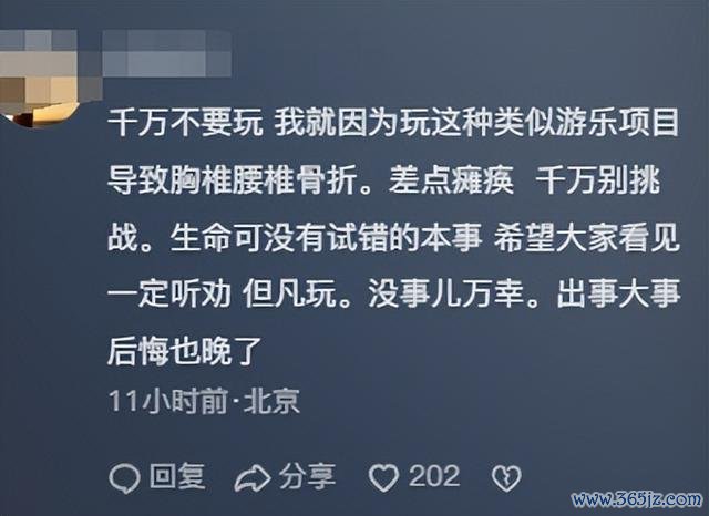 有网友暗示,因为玩这种访佛游乐样式导致胸椎腰椎骨折,差点瘫痪,千万别挑战。
