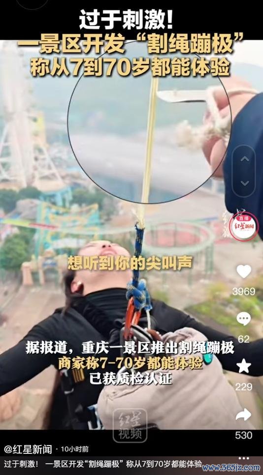 见过蹦极的,没见过眼睁睁看着“割绳蹦极”,这玩的即是心跳! 近日,重庆一景区为了加多搭客体验,推出了“割绳蹦极”样式,好多网友打飞的已往打卡。 跟着这个项量度爆火,有记者采访了商家,王先生暗示 ,这个样式是通过质检认证的,7岁-70岁的东谈主皆不错去体验。 对此,网友商酌区炸了,有网友暗示:责任主谈主员不错替我跳不?我思割绳! 重庆一景区推出“割绳蹦极 据四川不雅察视频知晓,“思听到你的尖叫声”,然后就看到一个算是全副武装的东谈主,被吊在绳索上,傍边伸出一把刀,在迟缓的将绳索堵截。 这是发生在