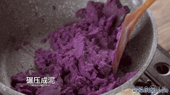 5. 取出蒸好的紫薯,碾压成泥,加入白糖。