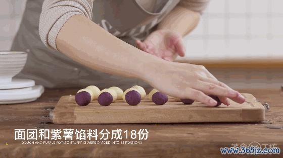 7. 将面团和紫薯馅料分红 18 份。