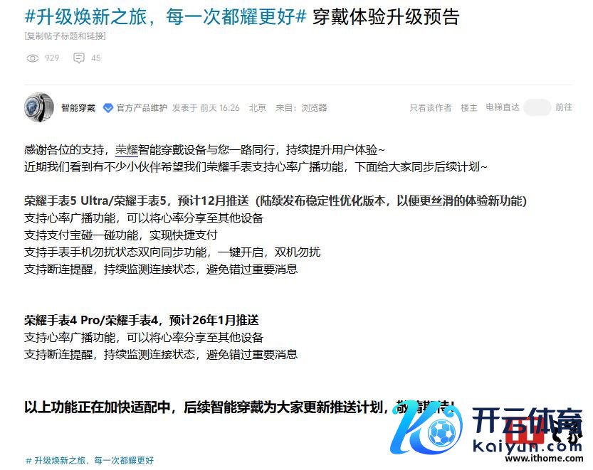 IT之家 8 月 31 日音问,官方家具爱戴前天在荣耀俱乐部发布了“穿着体验升级预报”,其中要点提到了心率播送功能的援助适配决议,以及荣耀腕表 5 Ultra 和荣耀腕表 5 的功能更新预报等。 ▲ IT之家开箱:荣耀腕表 5 Ultra IT之家附荣耀穿着体验升级预报如下: 荣耀腕表 5 Ultra / 荣耀腕表 5,展望 12 月推送(接续发布安详性优化版块,以便更丝滑的体验新功能) 援助心率播送功能,不错将心率共享至其他设置 援助支付宝碰一碰功能,已矣快捷支付 援助腕表手机勿扰现象双向同