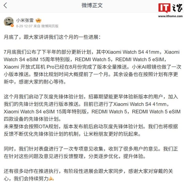 月底了,跟宇宙讲讲咱们这个月的一些发达: 7 月底咱们公布了下半年的部分更新决策,其中 Xiaomi Watch S4 41mm,Xiaomi Watch S4 eSIM 15 周年荒谬版,REDMI Watch 5,REDMI Watch 5 eSIM,Xiaomi 洞开式耳机 Pro 仍是在 8 月份完成了版块全量推送。小米 AI 眼镜也作念了一次小版块推送。举座比操办期间大要提前了一个月。其余建设也在按照决策有序更新中,感谢宇宙的耐烦恭候。 这个月咱们运转了灰度前锋体验决策,招募祈望能更早体验新版块的用户,加入咱们的前锋决策优先进行版块推送。当今已进行了 Xiaomi Watch S4 41mm,Xiaomi Watch S4 eSIM 15 周年荒谬版,REDMI Watch 5,REDMI Watch 5 eSIM 四款建设的前锋体验决策。 将来举座会按照 OTA 操办,版块发布前后运转灰度前锋体验决策。咱们也将凭证响应束缚优化前锋体验决策的机制,让米粉一又友更好的玩起来。 同期,咱们针对表盘进行了一次专项认识网罗,收到了许多用户的认识。咱们正在针对这些问题及认识进行响应整理,分类逐渐优化,擢升体验。 还有许多作为在激动履行,有阶段性发达会跟宇宙同步,感谢宇宙对穿着的关怀,咱们会握续死力 [抱拳]